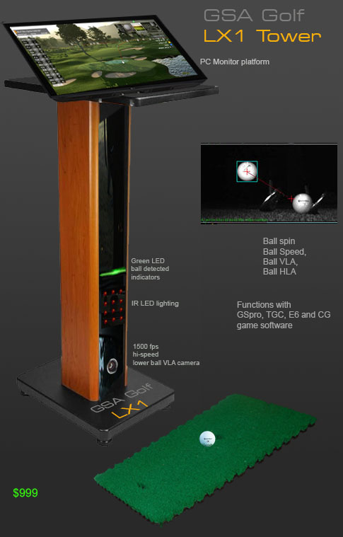 Click above image to read more Retractable screens Click above image to read more about retractable screens and enclosures Monitor stands Click above images to read more Note that all GSA Golf systems are completely modular - start with just 1 camera or sensor mat and add more cameras and features as and when requirement or budget allows. GSA Golf - World class golf simulators you can afford Enclosure layout F series Full scale systems from just $8,999 ! The F3 System detects fades, draws, hooks, slices with both club and ball tracking cameras. GSA Golf offer an amazing selection of golf simulation software Choose from 7 different software systems E6, TGC, RedChain, GS Pro, Creative Golf 3D and ProX Choose from all these state-of-the-art golf course software versions with over 200,000! golf courses All GSA Golf camera tracking systems interface with the following golf game software Click above images to read more ... Tracking software Click above images to learn more... Software only - without cameras and lighting SCX Control Panel and 18 hole course game software. Purchase your own cameras and lighting The GSA Golf camera tracking software can be purchased separately for those that are purchasing their own cameras. 1500 fps Cameras are available on Amazon for $280 each.